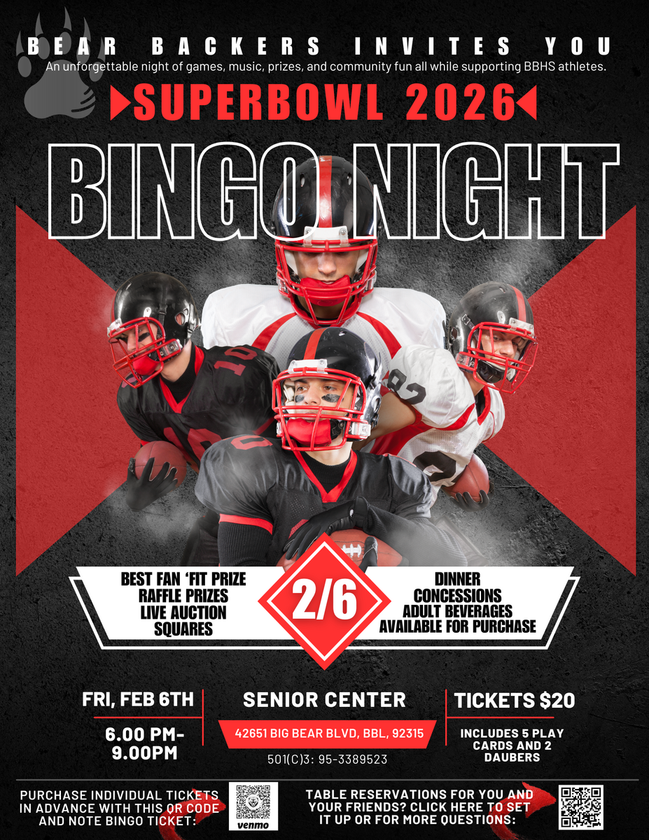 Bear Backers Super Bowl Bingo NightBear Backers is excited to invite families and the community to a Super Bowl–themed Bingo Night in support of BBHS student athletes. Friday, February 6 6:00–9:00 ...